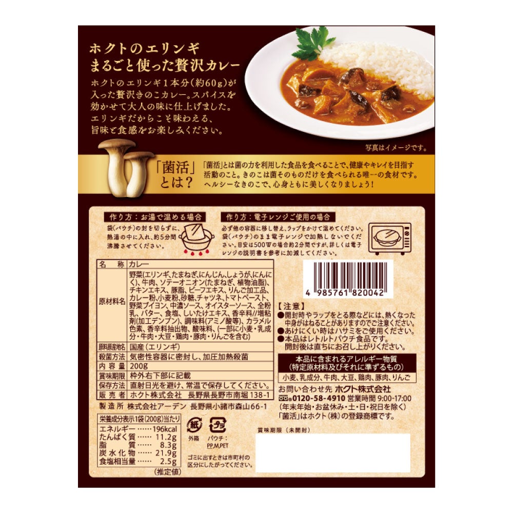 他の画像を見る ホクトのエリンギ まるごと使った菌活・贅沢カレー (200g 1人前 中辛) ¥ 520 税込 ホクトのエリンギ1本分(60g相当)がまるごと贅沢に入ってる!乱切りになったエリンギの独特の食感が楽しめる!想像以上の食べ応え! カートに入れる お気に入りに登録する 5.00 (1)