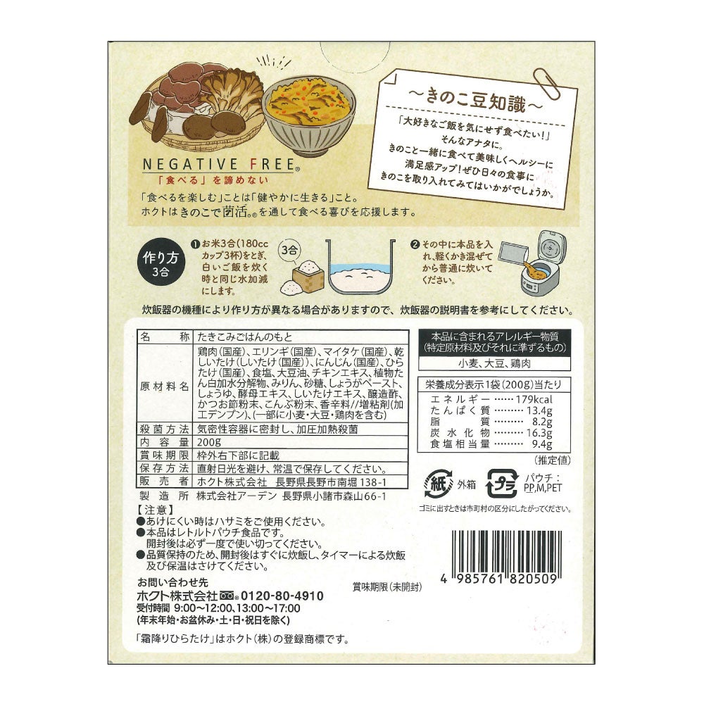 他の画像を見る 【10個まとめ買い】きのこが美味しい!国産具材で作った 炊き込みご飯の素 (200g 3合用 3~4人前) 当店通常価格 ¥ 4,800 のところ ¥ 4,424 税込 【3合用】こだわりきのこと鶏そぼろの旨味。 ホクトのエリンギ、マイタケ、霜降りひらたけを贅沢に使用! カートに入れる お気に入りに登録する (0)