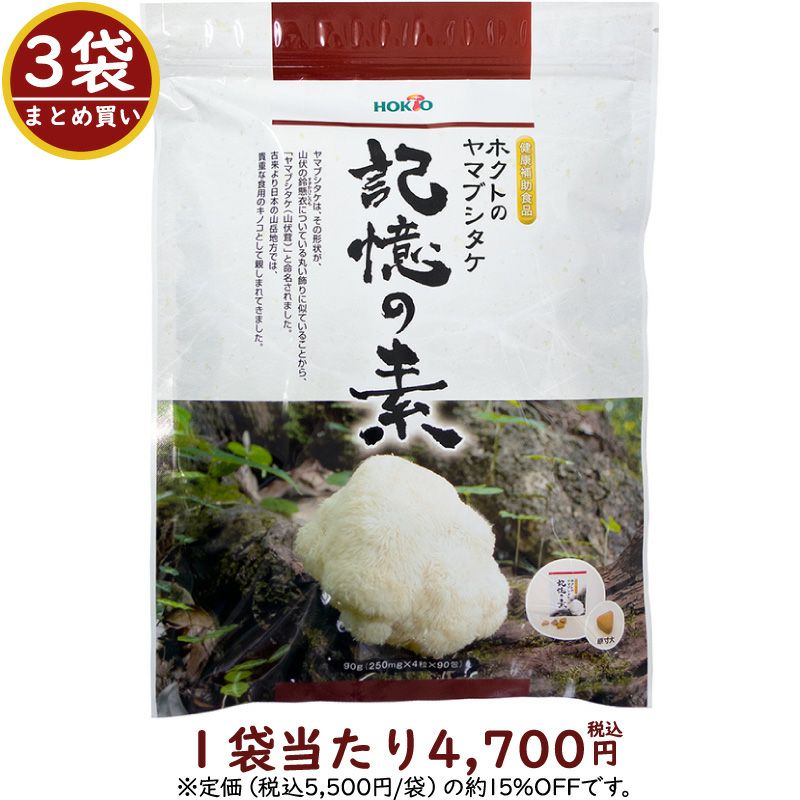 他の画像を見る 【WEB定期3】ヤマブシタケ「記憶の素」 (1袋90包入x 3袋:約3ヶ月) 3袋お届けコース【送料無料】 定期販売 通常定期価格 ¥ 11,980 税込 ●記憶の素にはエルゴチオネインがたくさん含まれています。 【定期購入で約27%OFF】「とにかくお得で便利」な定期コースはこれ! 詳細を見る お気に入りに登録する