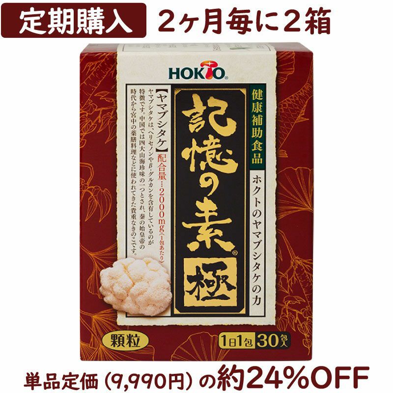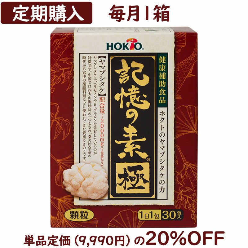 他の画像を見る 【WEB定期1】『記憶の素 極 (きわみ) 』 (1箱30包入x 1:約1ヶ月分) 1箱お届けコース【送料無料】 定期販売 通常定期価格 ¥ 7,992 税込 【毎月お届け定期で20%OFF】ホクトのヤマブシタケに加え、イチョウ葉、大豆レシチン、DHAなど注目成分を9種配合! 詳細を見る お気に入りに登録する