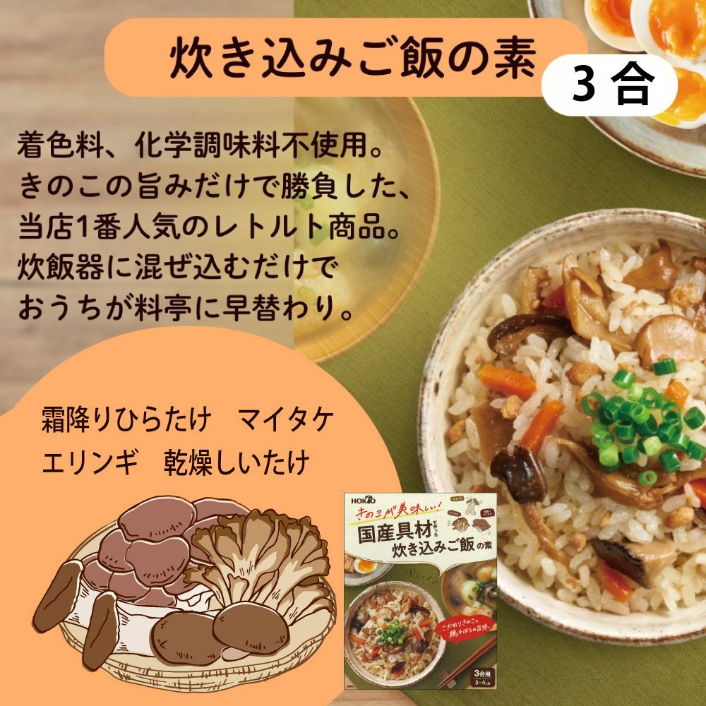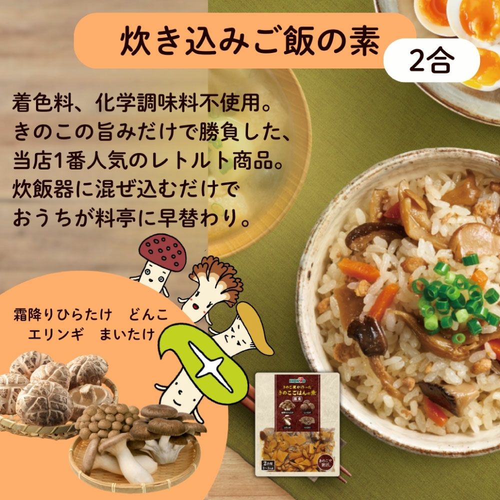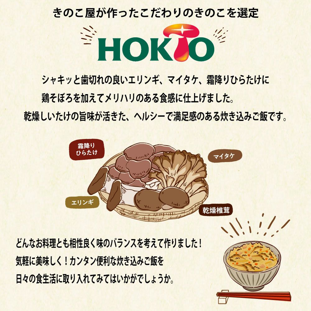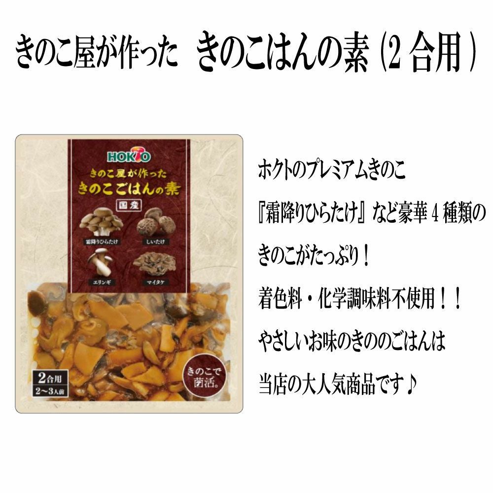 他の画像を見る 【5個まとめ買い5%OFF】きのこが美味しい!国産具材で作った 炊き込みご飯の素 (200g 3合用 3~4人前) 当店通常価格 ¥ 1,980 のところ ¥ 1,881 税込 【3合用】こだわりきのこと鶏そぼろの旨味。 ホクトのエリンギ、マイタケ、霜降りひらたけを贅沢に使用! カートに入れる お気に入りに登録する