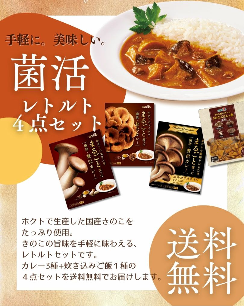 他の画像を見る 【ネコポス送料無料】ホクト菌活セットミニ (4種4品) ¥ 1,750 税込 エリンギ・マイタケ・霜降りひらたけをまるごと使った菌活・贅沢カレーと、4種のきのこ入り炊き込みご飯の素がセットになりました! 詳細を見る お気に入りに登録する