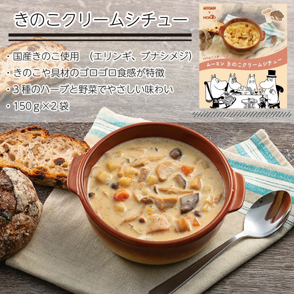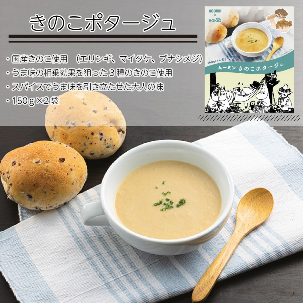 他の画像を見る ムーミン きのこスープセット (ポタージュx 2食・クリームシチューx 2食) 4食入り ¥ 1,300 税込 ムーミンの故郷、北欧フィンランドは「森と湖の国」。 森にはたくさんの種類のきのこが自生し、湖で魚を釣ったり、野原でベリーを摘んでジャムにしたり 自然の恵みで一年中おいしい料理を楽しめます。 そんなムーミンの世界を感じていただける2種類のきのこスープ。 温めるだけでおいしくお召し上がりいただけます。 カートに入れる お気に入りに登録する