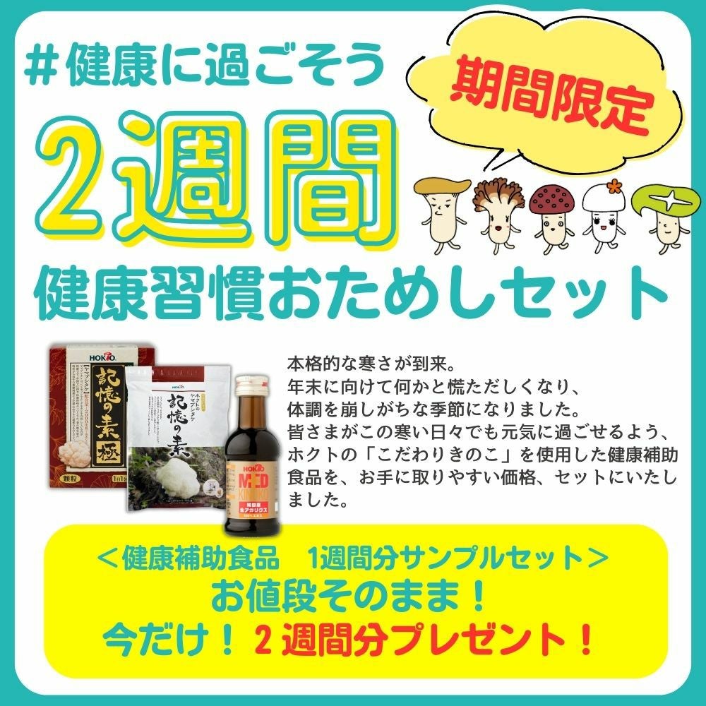 他の画像を見る 【今だけ!増量!!】定期申し込み時にお使いいただけるクーポンプレゼント♪ 【2週間トライルセット】ヤマブシタケ「記憶の素」 (7日分×2セット)【ネコポス送料無料 1000円】 ¥ 1,000 税込 【初回限定一世帯1セット限り】 通常1週間分のところ、倍の2週間分をお試し頂けるキャンペーン中♪ 冬の健康意識が高まるシーズンにホクトの健康補助食品で健やかな毎日を! まずはこちらで商品の粒の大きさ、飲み易さ、体調・体質との相性をご確認ください。 記憶の素にはエルゴチオネインがたくさん含まれています。 詳細を見る お気に入りに登録する