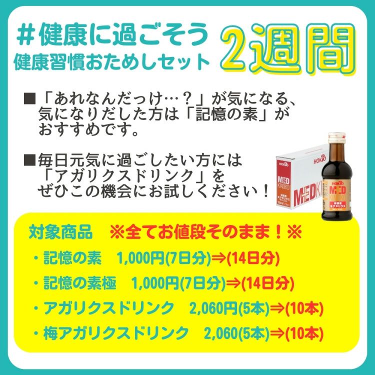 他の画像を見る 【今だけ!増量!!】定期申し込み時にお使いいただけるクーポンプレゼント♪ 【2週間トライルセット】ヤマブシタケ『記憶の素 極 (きわみ) 』 (7日分×2セット)【ネコポス送料無料 1000円】 ¥ 1,000 税込 【初回限定一世帯1セット限り】 通常1週間分のところ、倍の2週間分をお試し頂けるキャンペーン中♪ 冬の健康意識が高まるシーズンにホクトの健康補助食品で健やかな毎日を! まずはこちらで商品の粒の大きさ、飲み易さ、体調・体質との相性をご確認ください。 『記憶の素 極(きわみ)』1日1包、顆粒タイプだから飲み易く、忘れ難い! 詳細を見る お気に入りに登録する