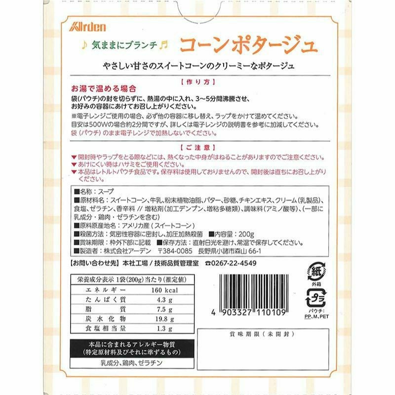 他の画像を見る 【20個まとめ買い8%OFF】気ままにブランチ コーンポタージュ (200g 1~2人前) 当店通常価格 ¥ 5,060 のところ ¥ 4,655 税込 やさしい甘さのスイートコーンのクリーミーなポタージュ カートに入れる お気に入りに登録する